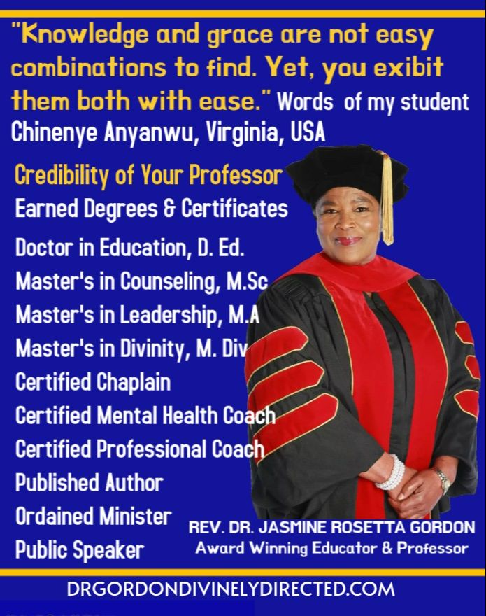 I am Rev. Dr. Jasmine R. Gordon your professor for this course. Learn from me, an experienced Certified Chaplain, Award Winning Educator, Professor, Professional Coach, Published Author and Notary Public to gain real-world insights and knowledge.